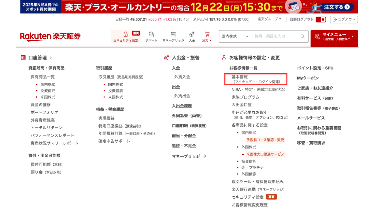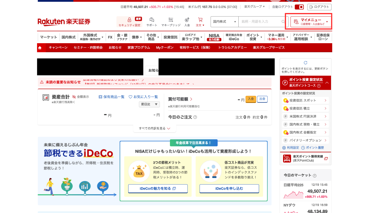 ① 楽天証券にログイン→マイメニューへ