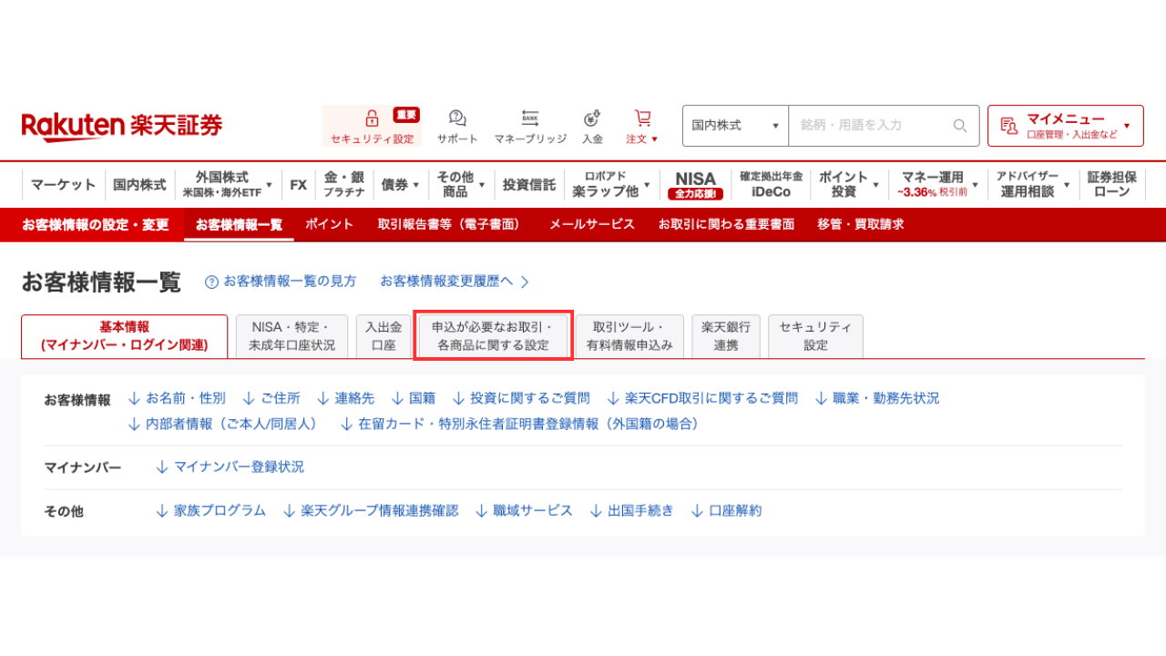 上部のタブにある「申込が必要なお取引・各商品に関する設定」に進みます。