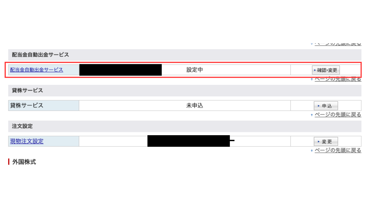 配当金自動出金サービスがあるので、右側の「確認・変更」を選択し設定完了。